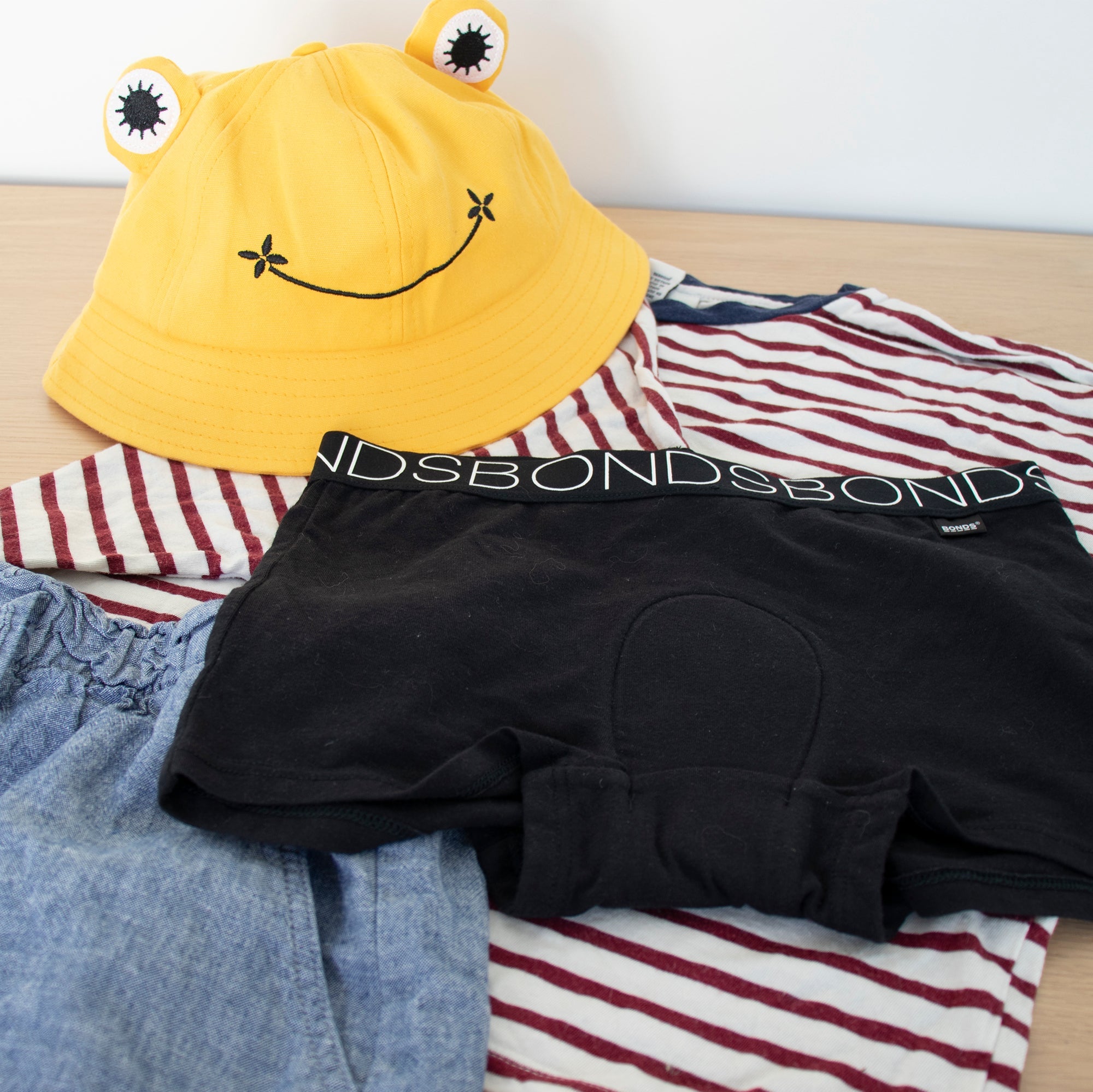 Waterproof and absorbent, 100% brushed cotton incontinence pad sewn-in to genuine BONDS® branded 'Boy-Leg' Short style underwear.