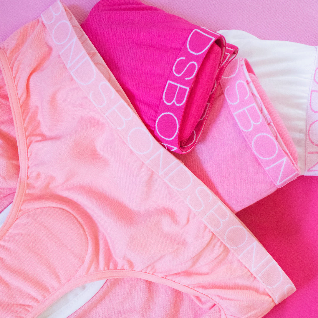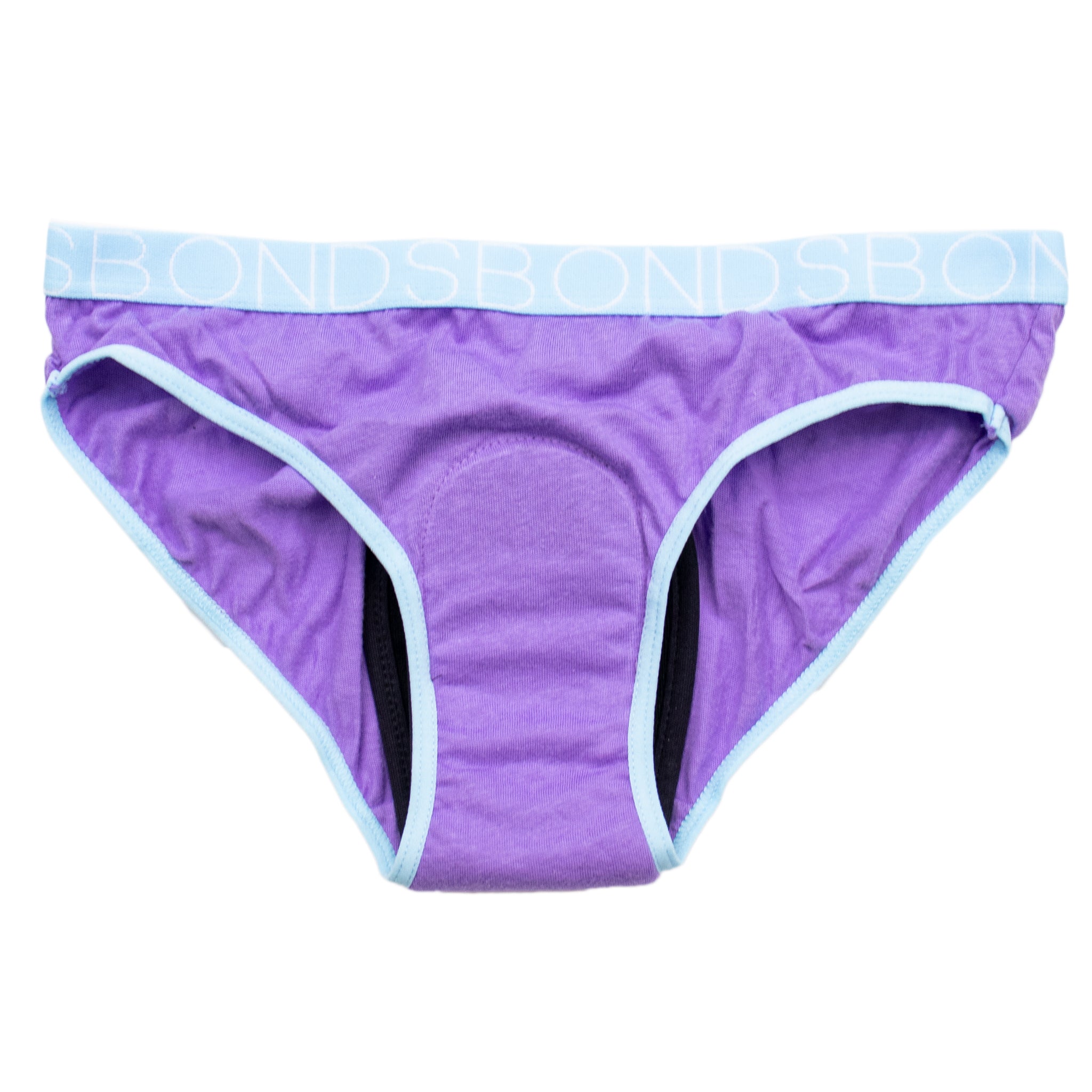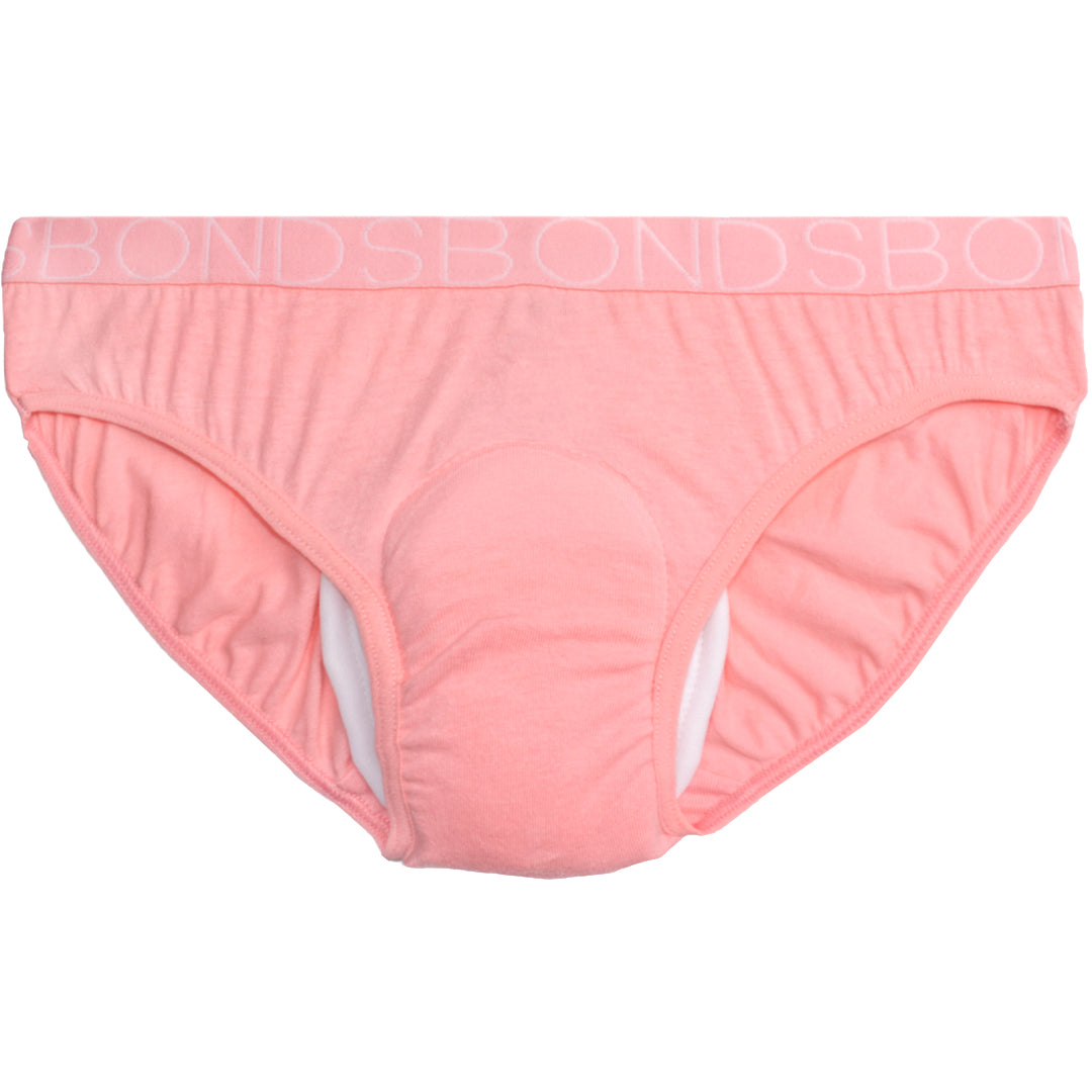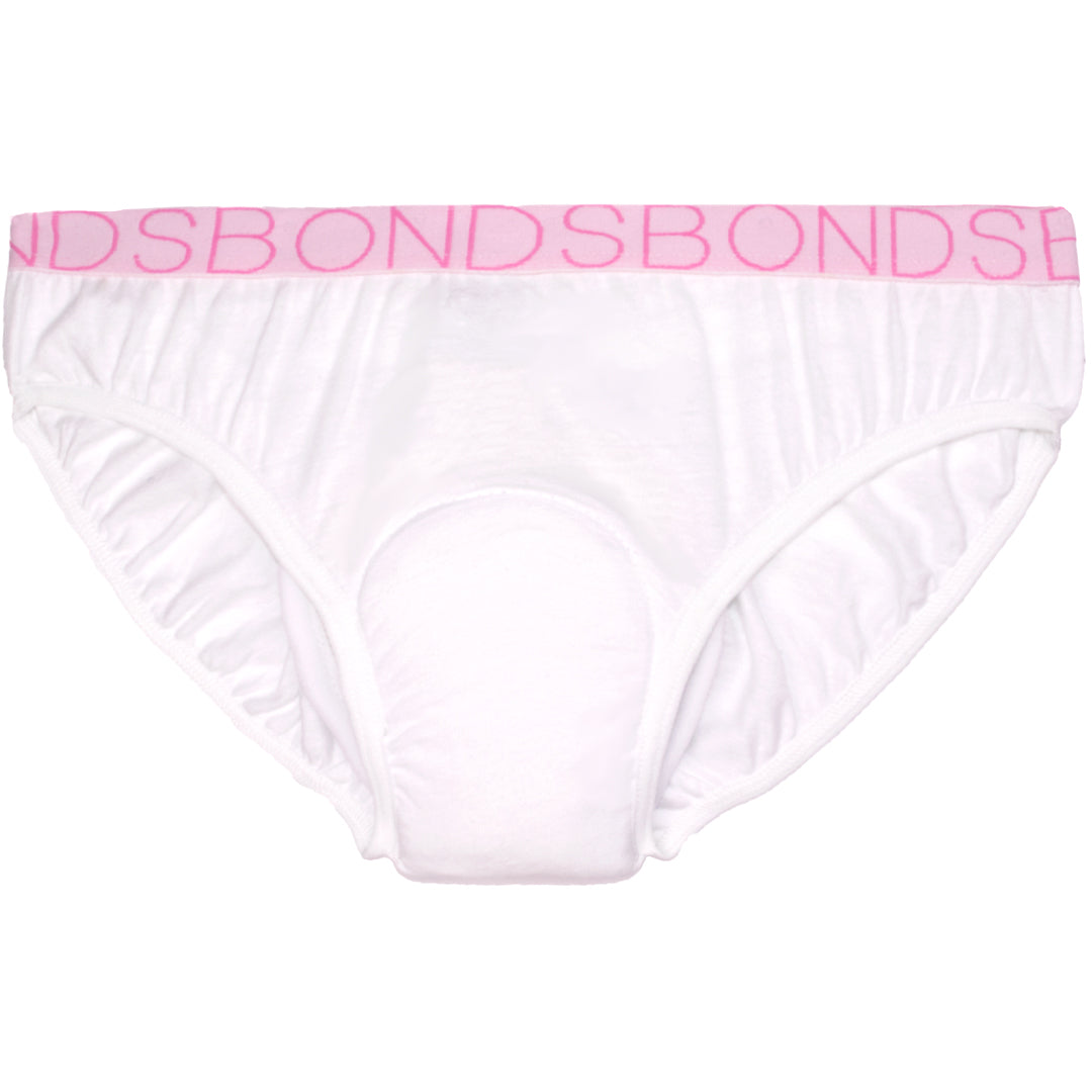 A practical 4-pack of genuine Girl's BONDS Bikini Brief underwear, each with a sewn-in waterproof incontinence pad designed for light urinary leakage and periods. Built for daytime protection that's comfortable and discreet, with a trusted Australian-made brand behind it.
