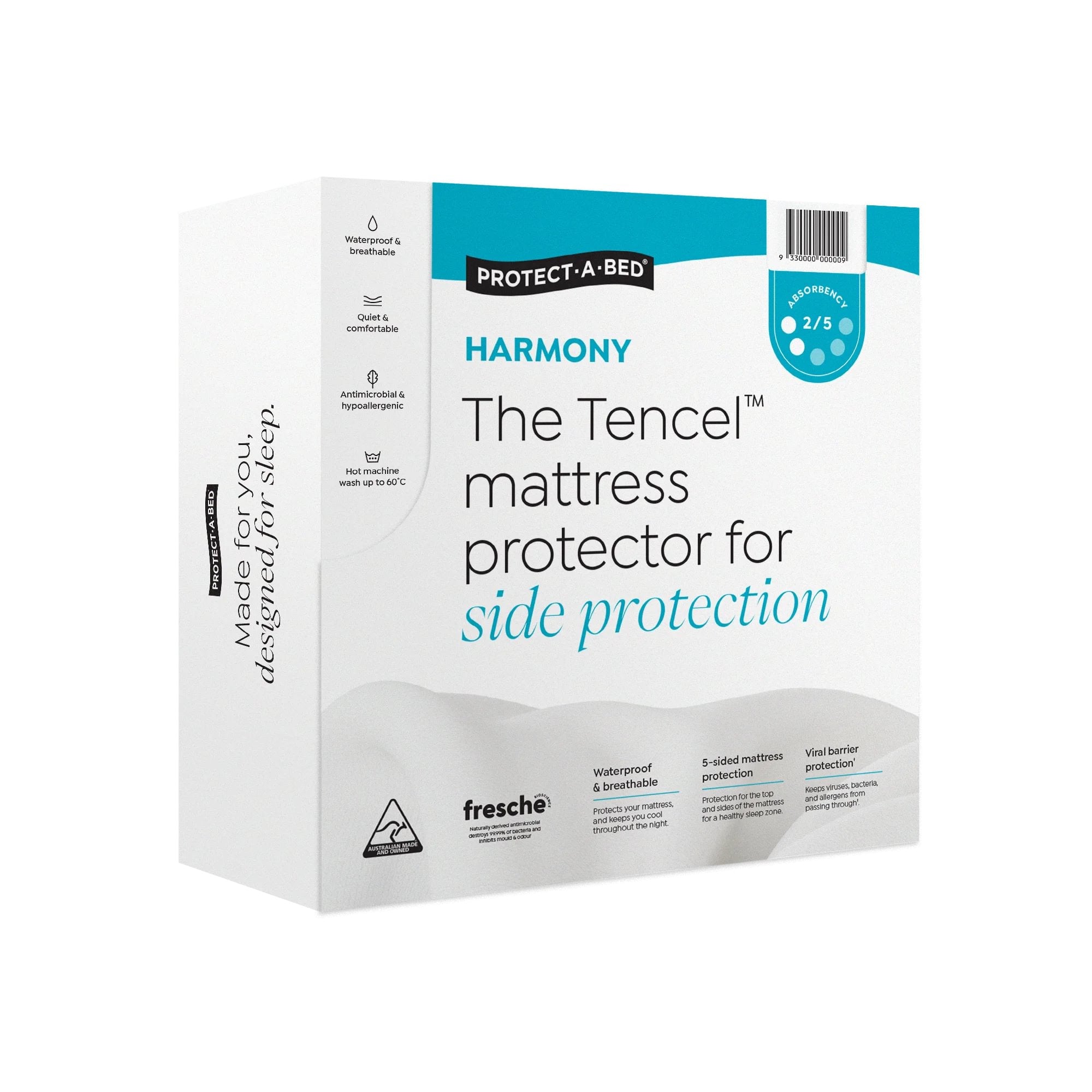The Harmony Mattress Protector from Protect-A-Bed® combines a hypoallergenic TENCEL™ sleep surface with 5-sided waterproof protection for a soft, breathable shield that guards your mattress and your family from everyday spills and accidents.
