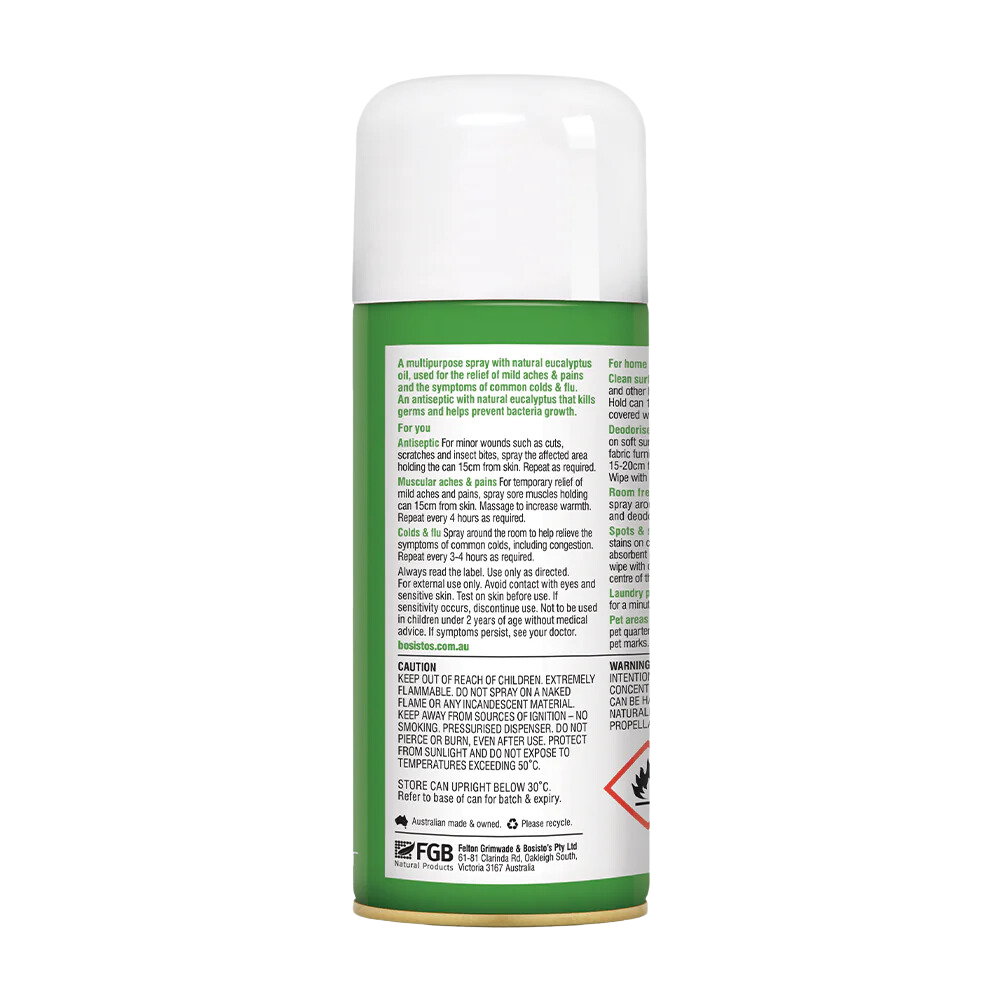 Bosisto's Eucalyptus Spray is a versatile first-aid spray designed to cleanse and soothe minor wounds, scratches, and insect bites with the natural power of eucalyptus oil. It’s gentle enough for the whole family, including children aged two years and above, and easy to use on the go.