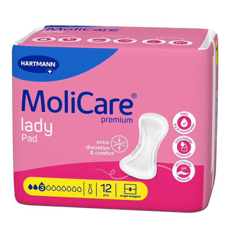 MoliCare Premium Lady Pads provide reliable protection for light to moderate bladder leakage, designed for comfort and discretion with a feminine shape, soft breathable materials, and a fast-absorbing core that locks in moisture and neutralizes odors.