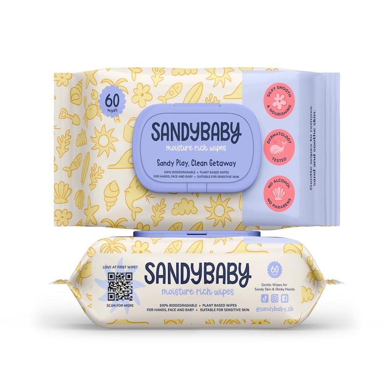 Sandy Baby Moisture Rich Wipes are plant-based disposable wipes designed to gently remove sand, salt and grime while hydrating delicate skin. Perfect for beach days, park outings, or on-the-go cleanups, these wipes are soft, safe, and suitable for babies and kids.