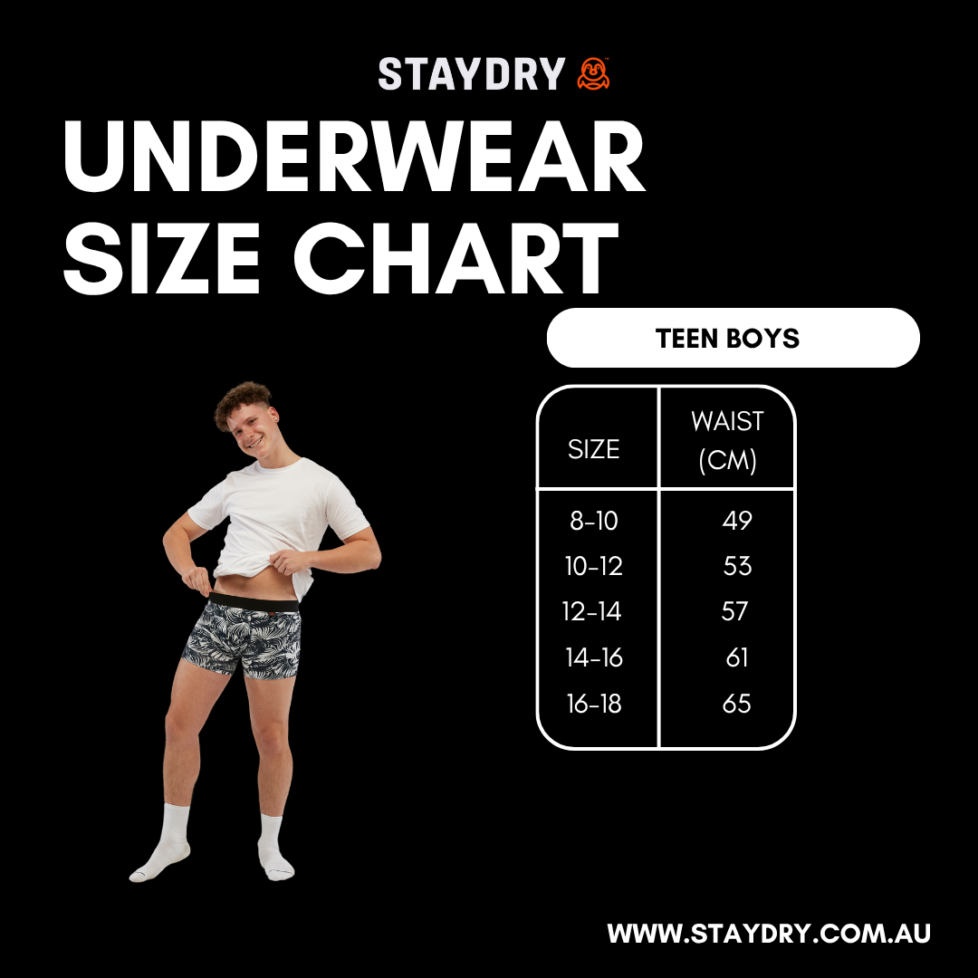 StayDry Teen Boys 5 Pack Undies deliver reliable, discreet incontinence protection in comfortable bamboo fabric—designed for teens who want to stay dry, fresh, and confident all day.