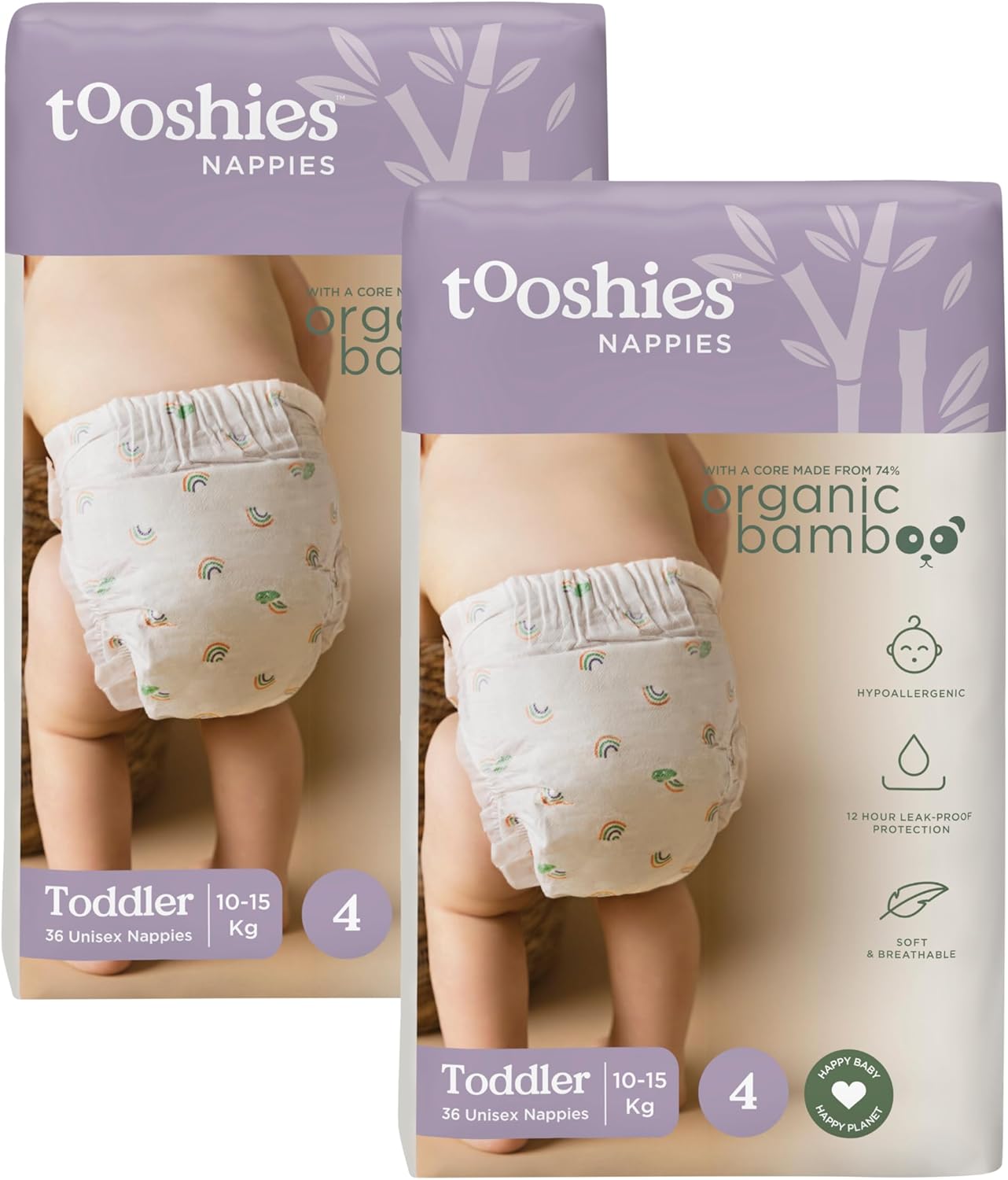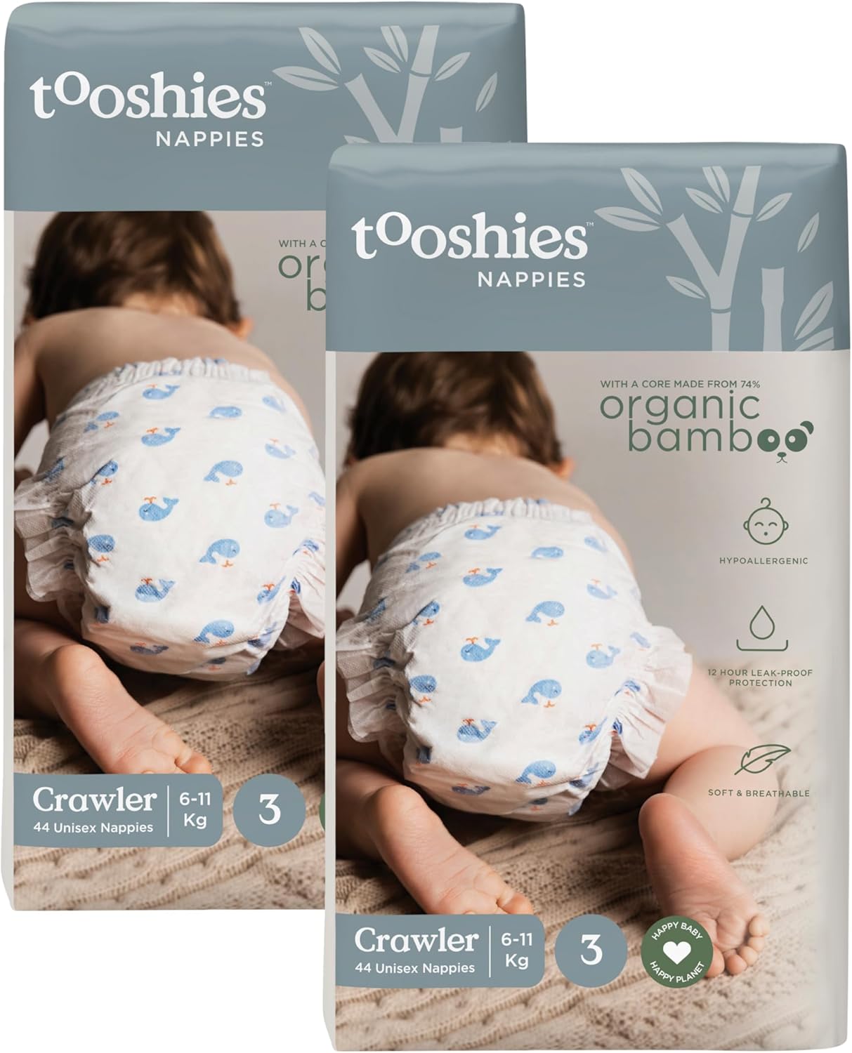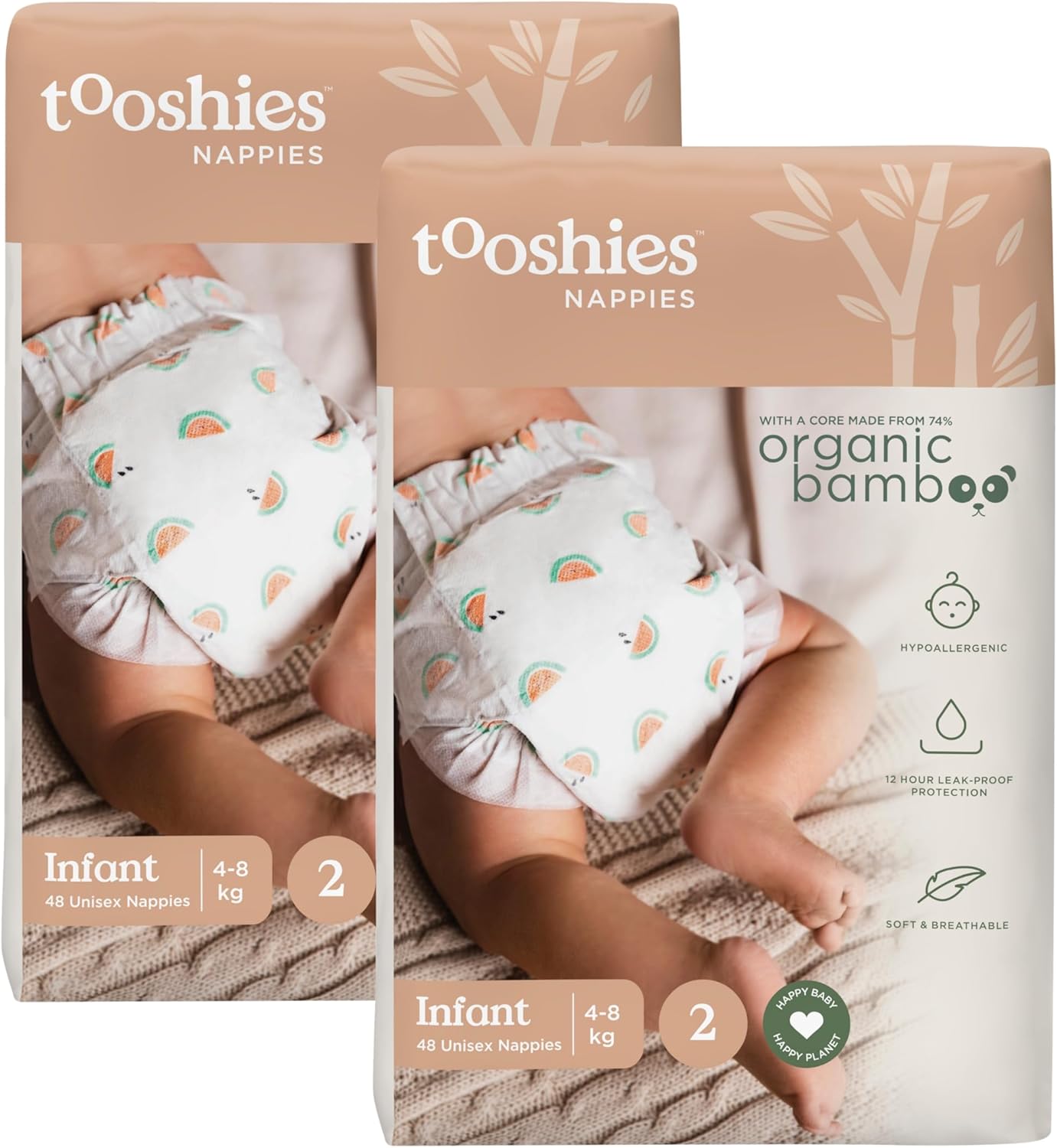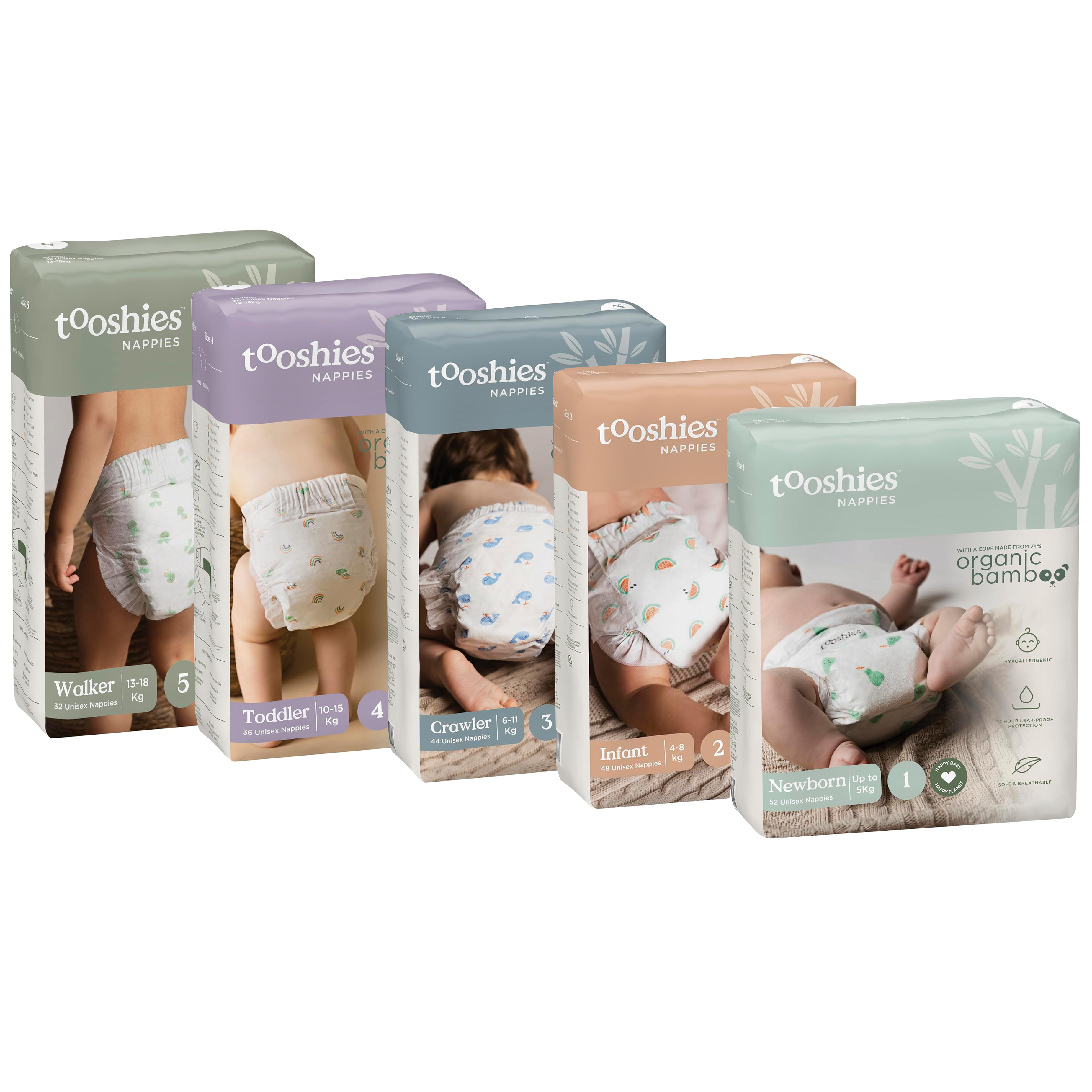 Tooshies Disposable Nappies are soft, breathable diapers designed to keep babies dry and comfortable from newborn through to toddler. They combine reliable performance with an eco-conscious bamboo core for worry-free day and night wear.