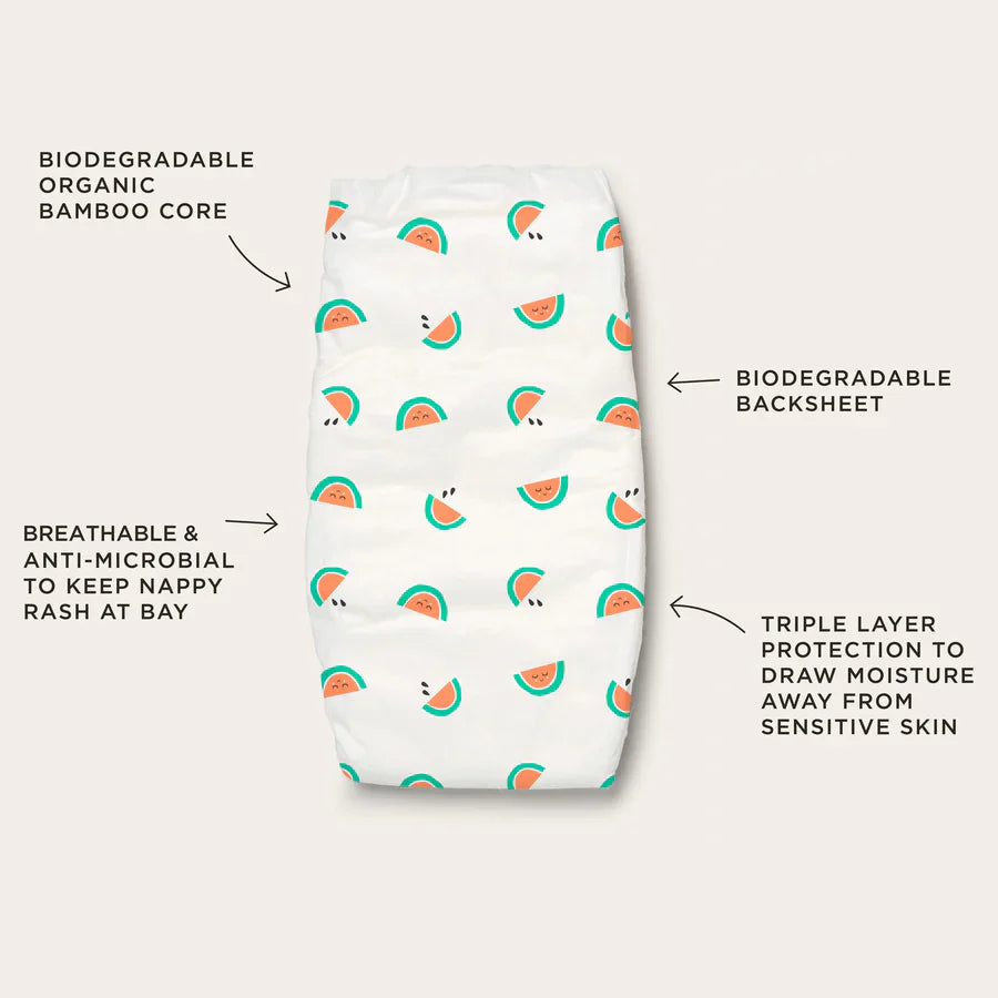 Biodegradable bamboo core — 74% organic bamboo for a soft, absorbent core that helps keep little ones dry.